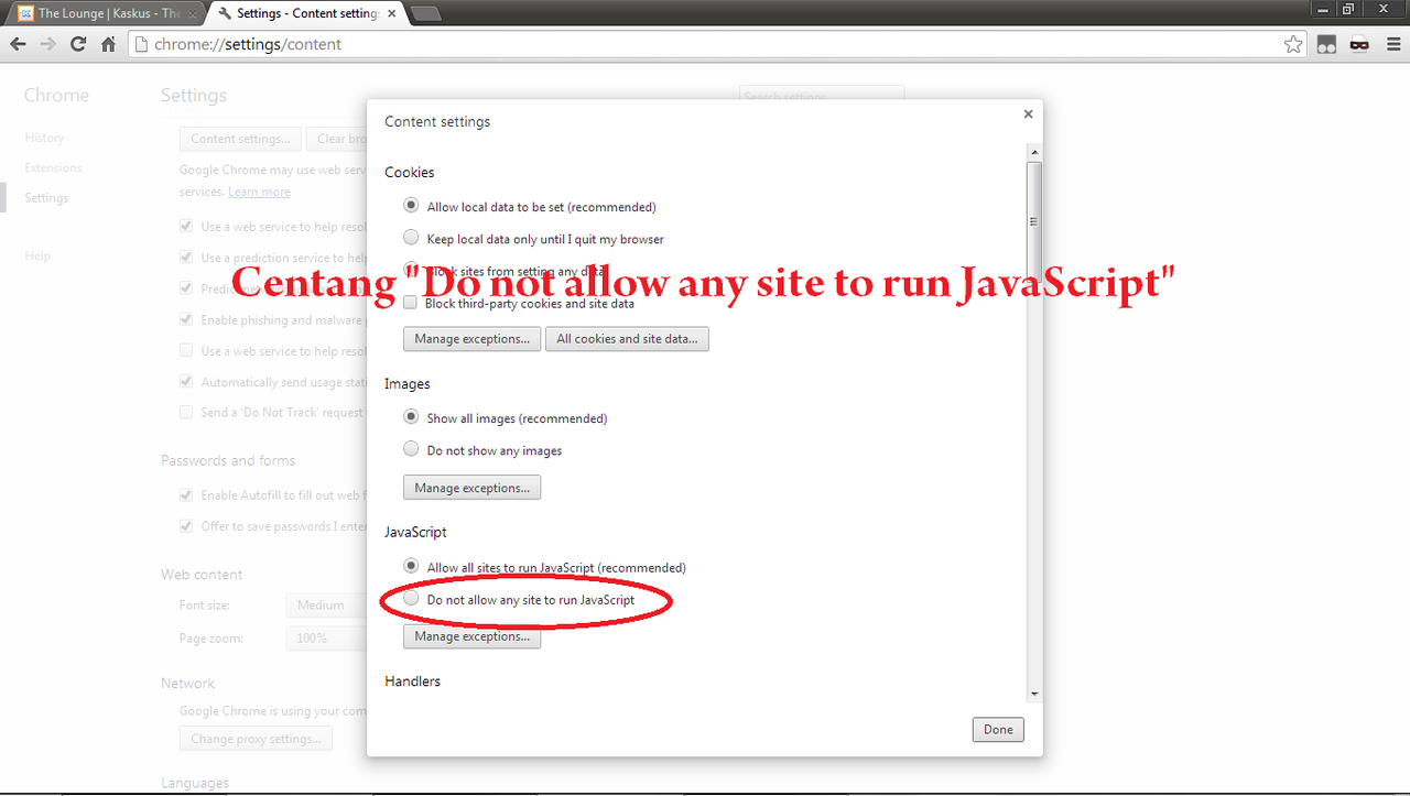 5. centang "Do not allow any site to run Java Script, kemudian done